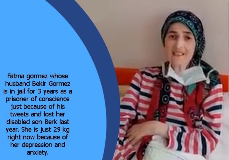 According turkishminute.com, Fatma Gormez, a former teacher who was removed from her job in the aftermath of a failed coup in Turkey in July 2016, now weighs only 29 kilograms due to a series of health problems, Fatma is calling for the release of her husband to enable her to continue living via a video message posted on Twitter.[1] (Bekir Gormez is accused of allegedly posting tweets on his account.)