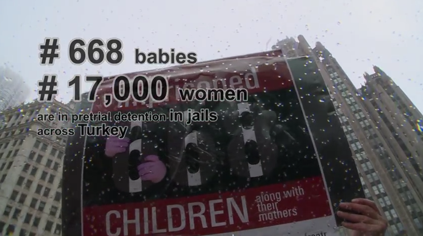 668 babies, under age of six, and 17000 women are in pretrial detention in jails across Turkey. Group of people gathered in Chicago to demand freedom of innocent children jailed in Turkey.